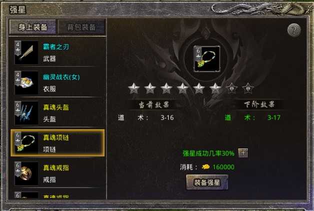 1. 消耗金币对人物装备进行强星,更高品质的装备能强星的最高阶等会更高